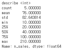 아래의 "n_sales"는 int형식인 "n_sales" 컬럼의 describe()결과를 보면 평균, 표준편차, 사분위값등의 통계정보가 표시됨을 알 수 있다.