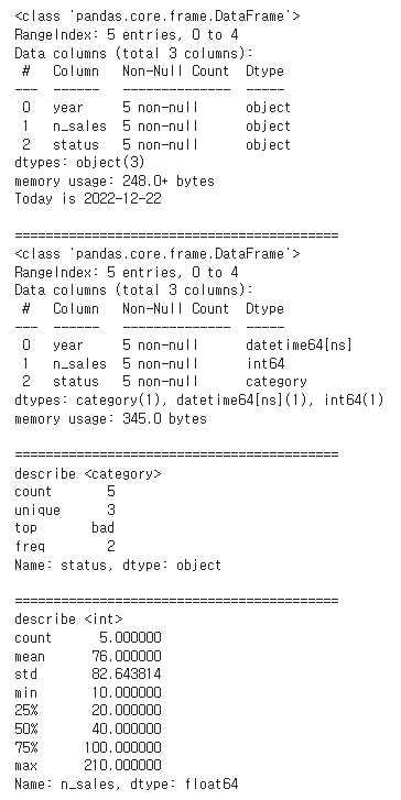원데이터를 datetime, "int", "category"데이터로 형식을 변화시키고 category와 int형 데이터의 describe()함수의 결과의 차이를 확인한다.