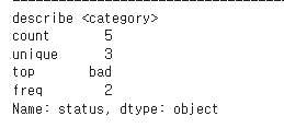 하지만 category형식으로 변환되 "status" 컬럼은 status상태를 표현하는 카테고리값들의 종류를 보여주는 unique값, top, freq등의 정보로 표현됨을 알 수 있다.