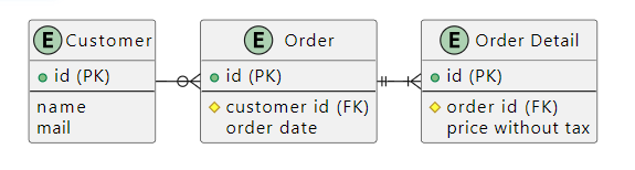| Order 엔터티 | + id (PK): id 필드는 기본 키입니다. # customer id (FK): customer id는 외래 키(Foreign Key)로, Customer 엔터티와 연결됩니다. order date: 일반 속성입니다. |