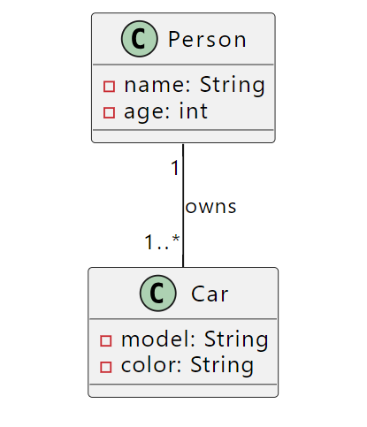 이 예제에서는 Person 클래스와 Car 클래스 간의 1:다(1..*) 연관 관계를 나타내며, Person이 여러 대의 Car를 소유하고 있음을 의미합니다.