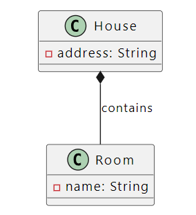 이 예제에서는 House 클래스와 Room 클래스 간의 복합 관계를 나타냅니다. House가 사라지면 Room도 사라집니다.