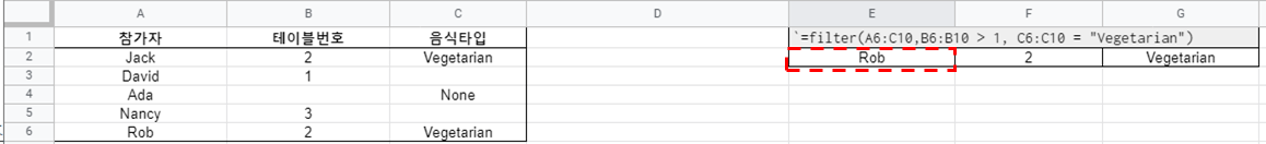 최종 필터링된 결과를 출력하기 위한 위치인 E2위치에 조건2를 추가하여 함수를 적용합니다. E2에서부터 G2까지 조건1과 조건2를 만족하는 데이터가 필터링되어 출력됩니다. 모든 조건을 만족하는 "Rob"의 데이터만 출력되었습니다.