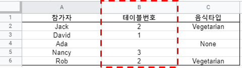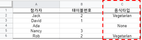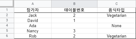 원본 정보가 아래와 같이 참가자, 테이블번호, 음식타입으로 저장된 상태입니다. 이 상태에서 테이블 번호가 1보다 큰 테이블 중에서 음식타입이 Vegetarian인 정보만 필터링하여 새로운 데이터를 만들어 보겠습니다.