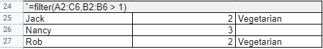 | A2:C6 | B2:B6 > 1 | C2:C6 = "Vegetarian" |